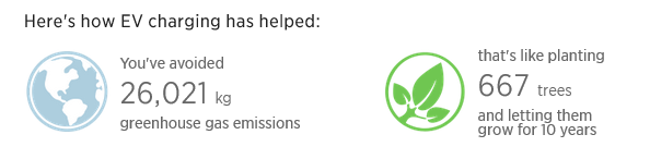 Driving electric is an important way to reduce reliance on oil and fossil fuels and decrease greenhouse gas emissions. We appreciate you being a champion for the environment and supporting a cleaner and greener way to get around. We estimate the emissions you've avoided based on the energy dispensed and show three growth equivalents form the EPA. Actual emissions avoided may be higher or lower depending on how your electricity is generated locally.