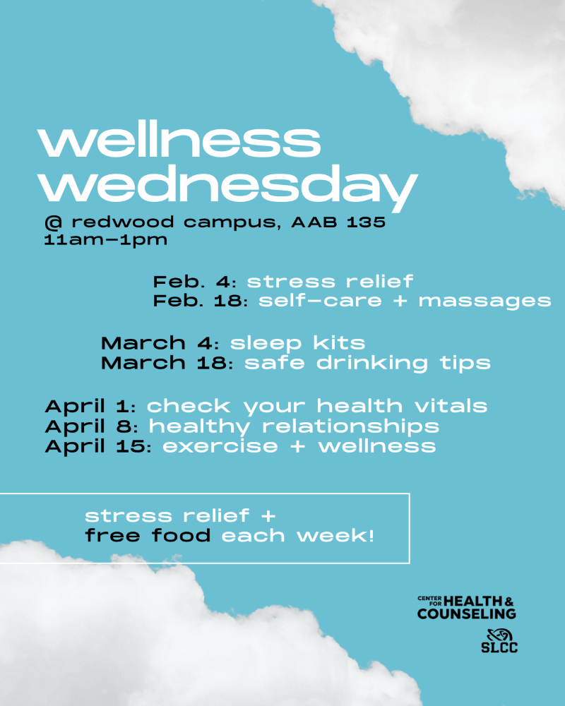 Can’t make it to Wellness Wednesday? Take one of our 8 self-assessment quizzes on the "CHC & Me" page and don’t forget to follow us on Instagram @slcc_chc.