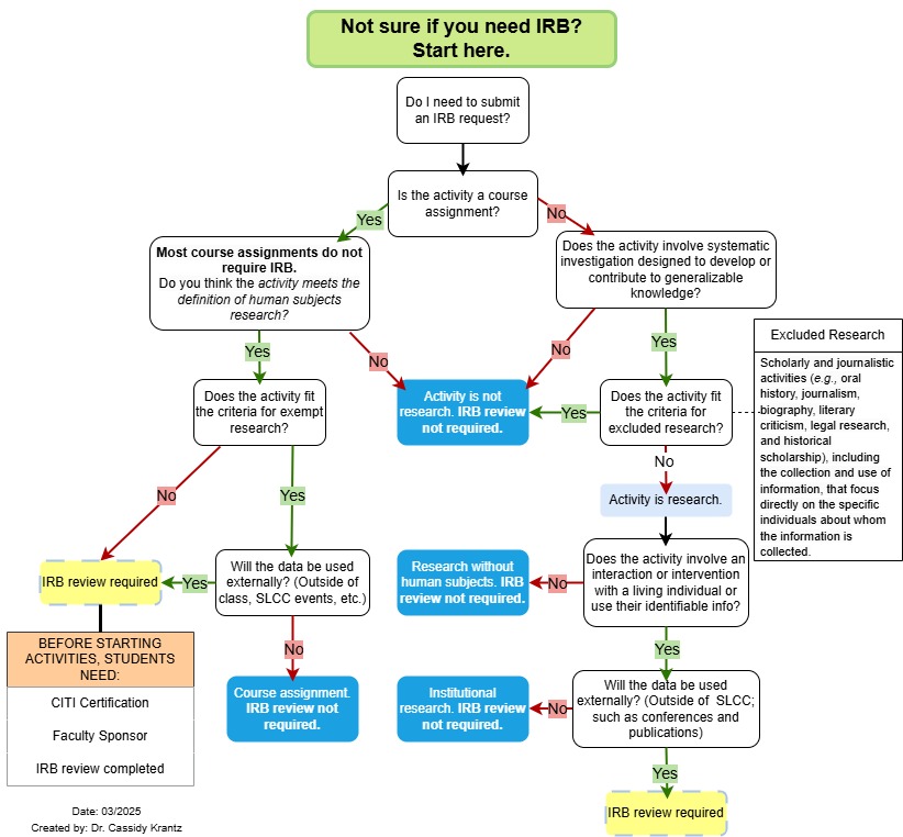 In addition to the request process, surveys for research involving human subjects must be reviewed by SLCC’s Institutional Review Board (IRB). For more information about the process of obtaining IRB approval or exemption for a survey See Institutional Review Board | SLCC. If you are unsure about whether your survey involves human subjects research or about needing IRB approval, this flowchart was created to help.
