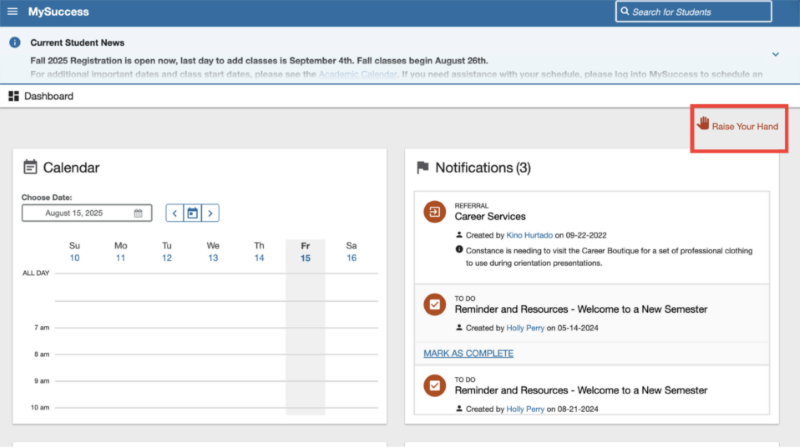 - On your MySuccess Dashboard, click on the "Raise Your Hand" Button