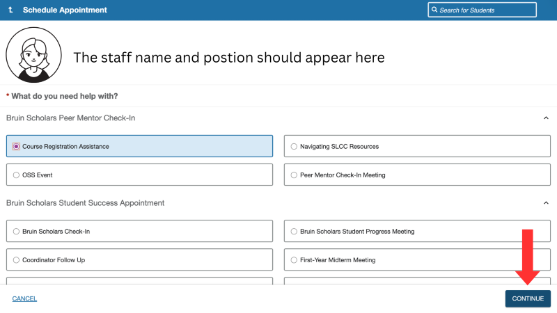 9. Please select the reason for the meeting (meeting option will vary according to staff your meeting with), then click "Continue"