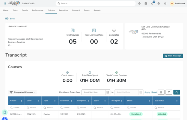 - The transcript screen will show you every training you have enrolled in, which includes required training, safe hire, and any staff development courses you have taken. You may print your training transcript.