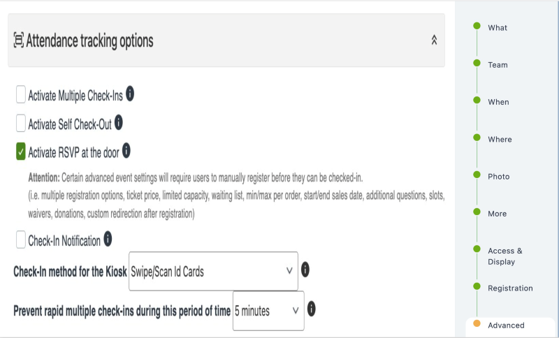 3. Once you start a new Blank Event Template, it will take you to the webpage to start creating your event. The page will break down your event in "what", "when", "photo & flyer", "more details", "access & display options", "Registration options" and "Advanced options".