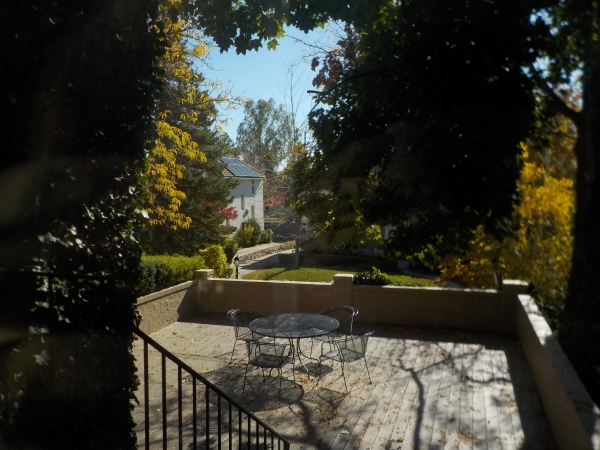 This picture depicts a porch. The porch has leaves and a table. The porch overlooks a street. Though cars are typically associated with noise and pollution, making up the plants around us, a park has much greenery, helping the planet by taking away the carbon dioxide.