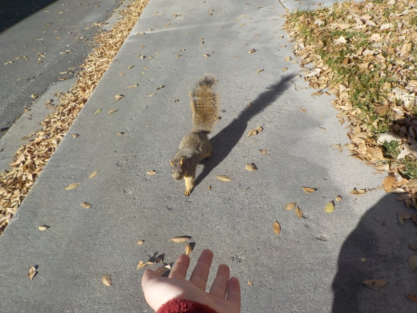 This is a photo of a squirrel that came up to me after school. I was going to enter my home but then the squirrel came up to me bravely and stared at me like it wanted food so, of course I ran inside and got some almonds to give the animal. The squirrel came closer to me but still maintained a distance, so I just set the almonds on the ground and took a few steps back.