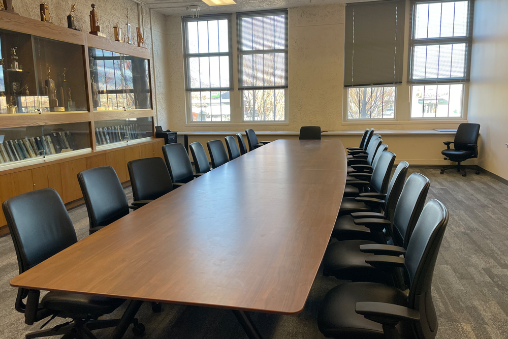Refurnished and supported by the South High Alumni Association, The Alumni Room is setup like a board room for 18 people seated. U-shaped board room table, projector and screen.