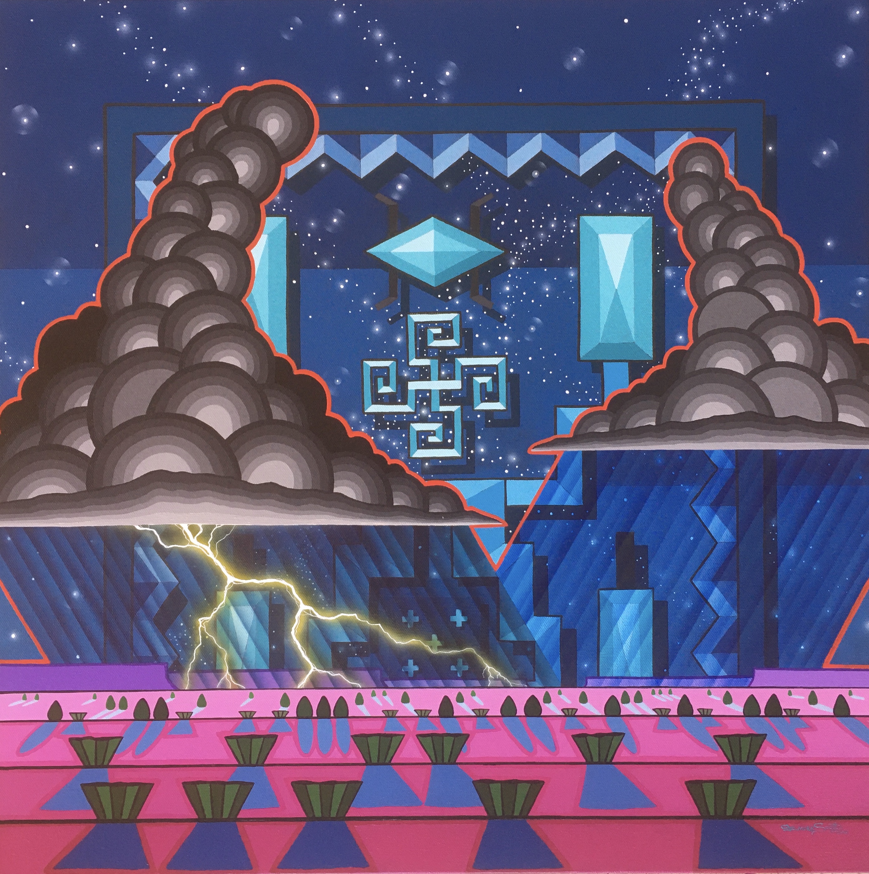 This piece is my interpretation of a night storm. Using a traditional rug design of a Storm Pattern.