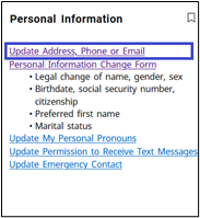 From there, you may select View Address(es) & Phone(s) to verify your information, or Change of Address, Phone, Email to update your information. To change or update your name, please contact the Office of the Registrar.