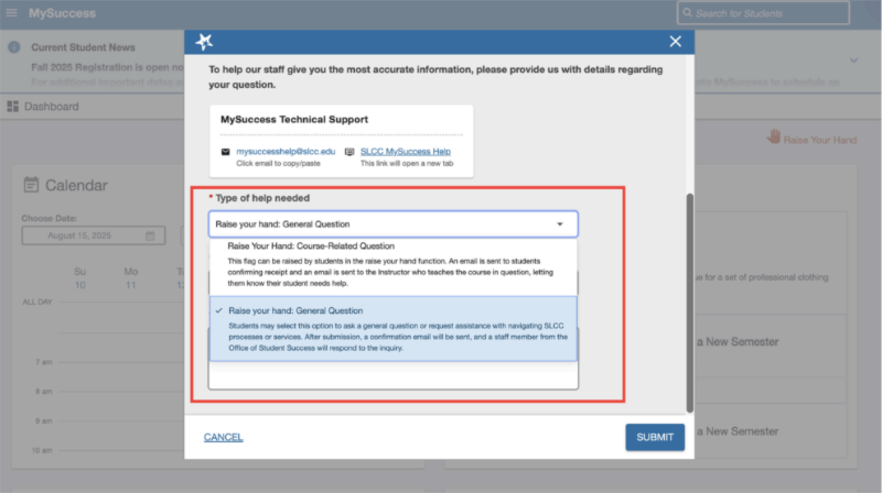 You can quickly "Raise Your Hand" to ask a general question about SLCC's processes or services from your main menu on MySuccess. It will send your request to a dedicated staff member, who can then refer you in the right direction or answer your question within less than 24 hours.