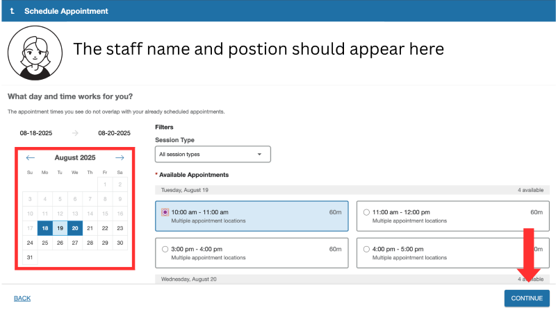 10. Use the calendar to select a range of days that works with your schedule (you must select a start day and an end day for the range). Please note the locations available when picking a time. Once you have selected an appointment time, click "Continue."