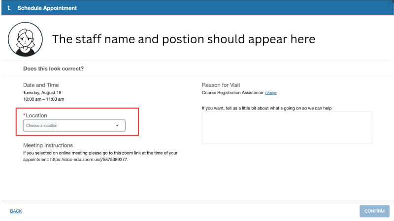 11. Choose the location for your meeting. If in person, their office location should appear after being selected. If you prefer online, the link can be found in the meeting instructions.