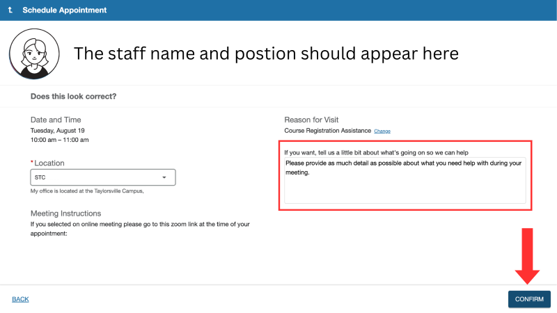 12. Fill in the text box with the details of your reason for meeting. This helps us prepare and better assist you. After choosing a location and filling in the text box you can click "Confirm"