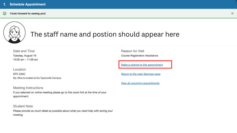 13. This is the confirmation page. We recommend students take a picture of this screen. You can also make changes to your appointment here.