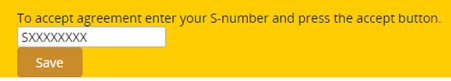 5. Once you have read the agreement, in the blank box below you will enter your student number. Remember to include “S” You should have a total of 9 characters in your student number. Hit the save button.