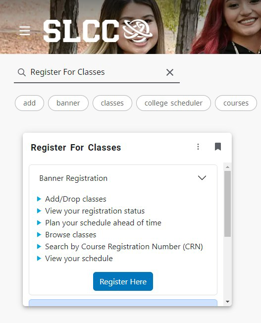 2. Search for the Register For Classes card (You can bookmark it by clicking the little icon in the right-hand corner)