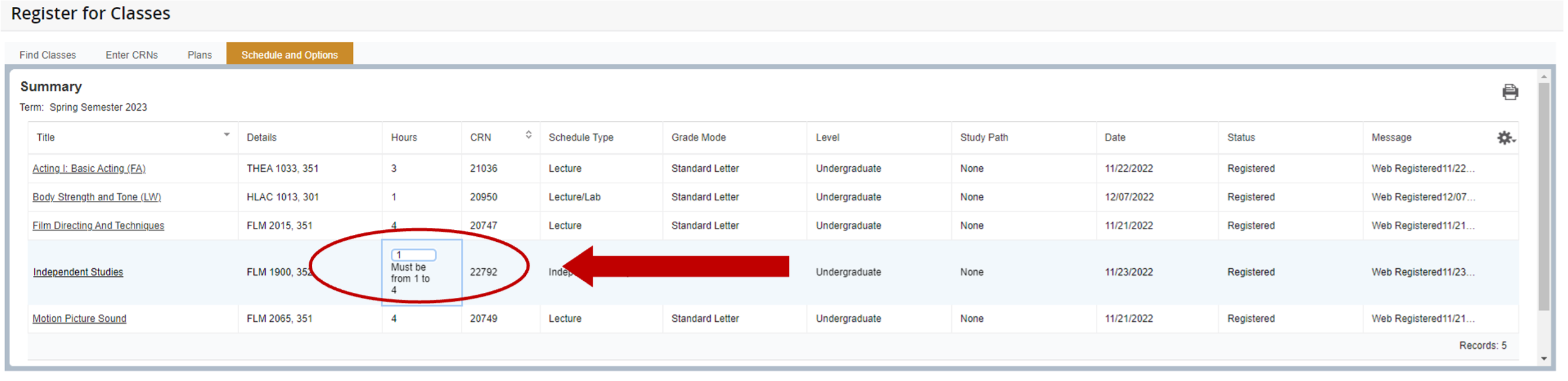 2. Under Hours, click into the field and type your desired credit hour(s)