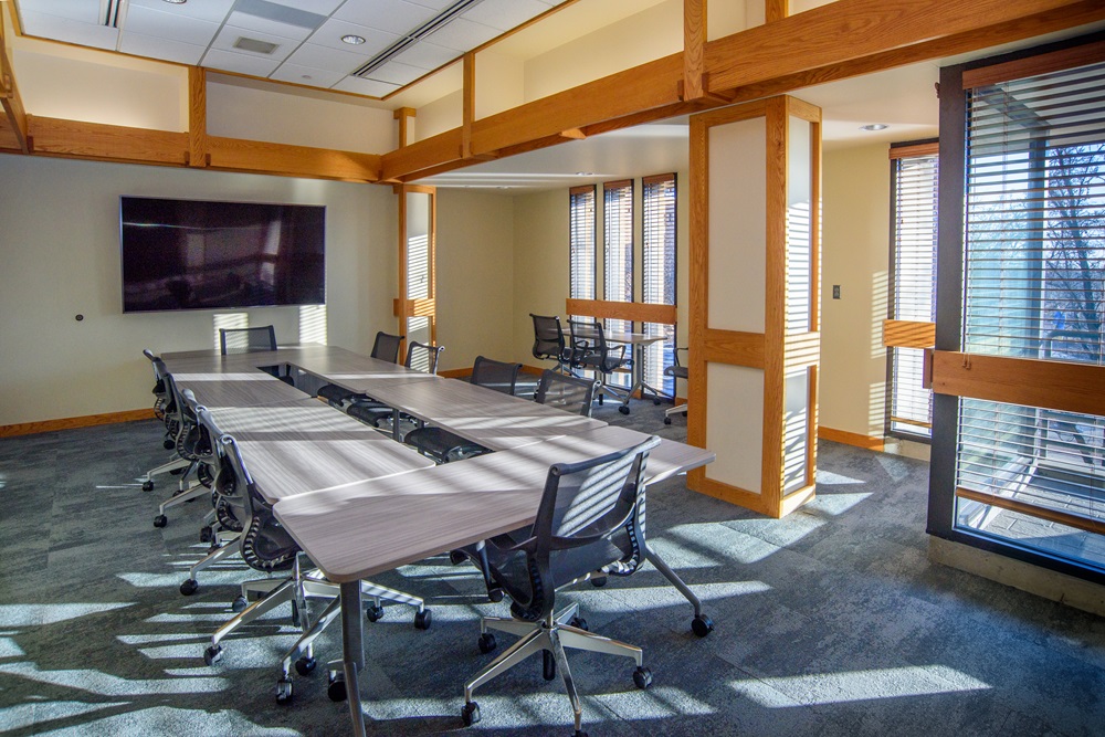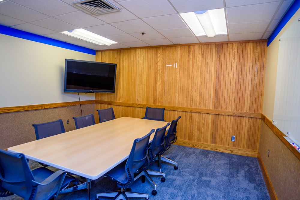 The Board Room accommodates 12 people seated around a large conference table. A whiteboard and screen are included with the room.