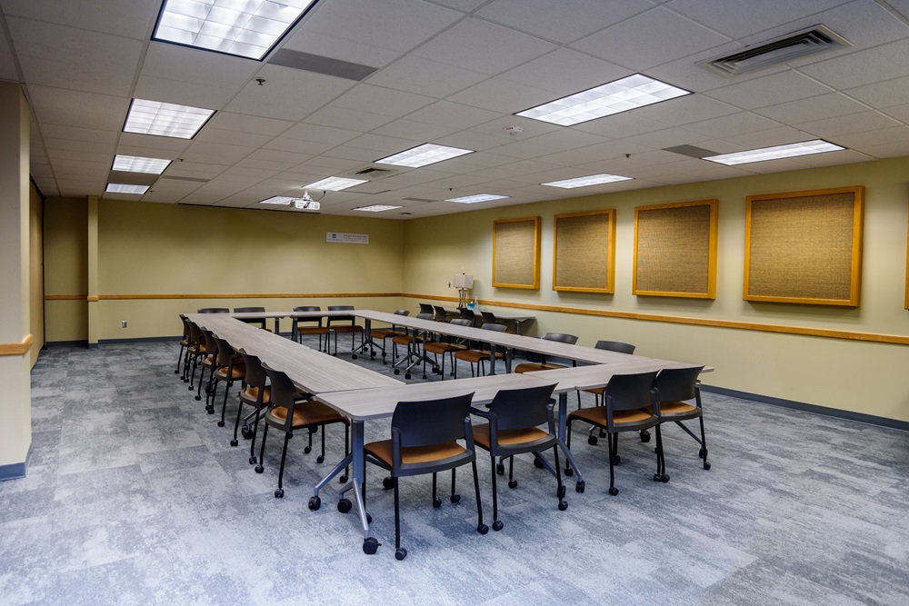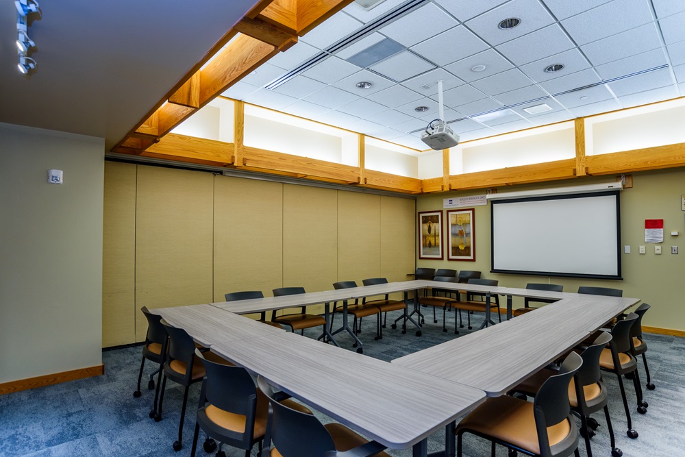 The Senate Chambers is furnished with tables permanently set in a circle creating a board room atmosphere. This is a great conference space for 18 to 20 people and is used extensively by our Student Government.