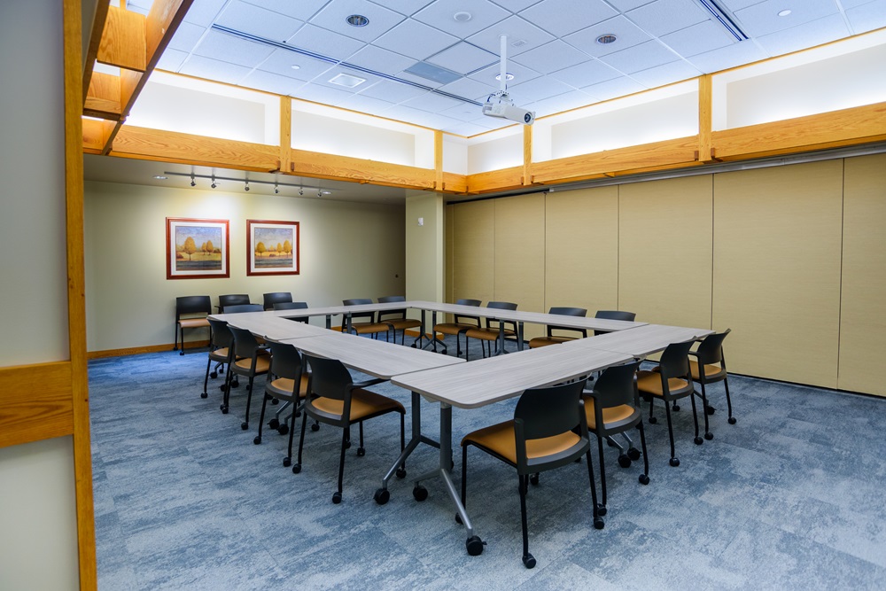 These rooms may be used together or separately. Individually, each room will seat 35 theater style, 18 classroom style and 20 conference style. Together they will seat 70 theater style, 40 classroom style and 70 banquet style. These rooms are furnished with a mounted whiteboard and screen.